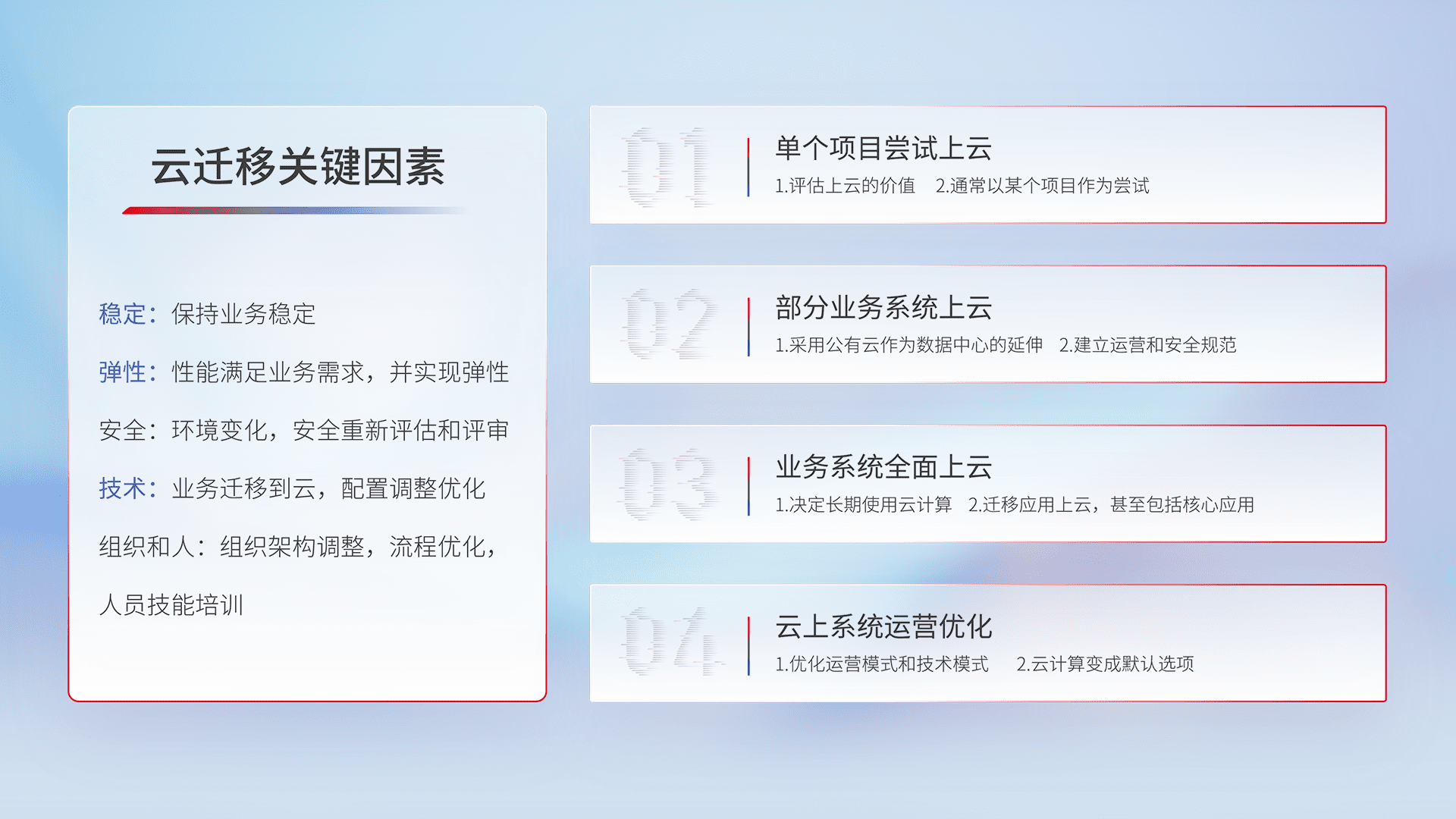 结合实际业务,,,从规划设计、、、云平台选型、、、、云原生改造、、、数据迁移、、、集成交付,,,迁移全过程为客户识别最佳上云路径,,,,做好风险识别管理,,设计网络架构、、身份权限、、、安全审计合规、、、操作审计、、、日志审计、、、监控告警策略、、多站点容灾设计等,,,,对云上基础设施进行整体规划,,,,提升IT治理水平,,,,以满足弹性、、、高可用、、、、高性能的需求。。。